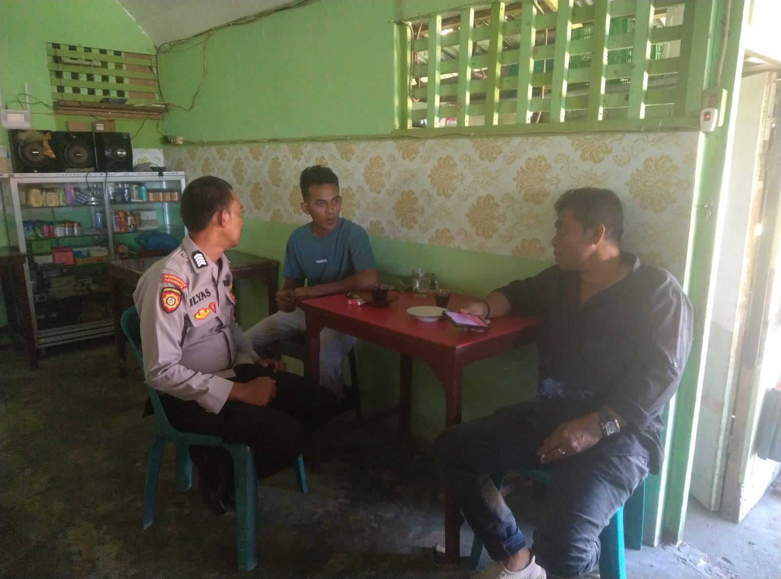 Sambil ngopi, Bripka Ilyas memberikan himbaun dan pesan-pesan kamtibmas kepada masyarakat dan mendengarkan curhatan warga binaannya.