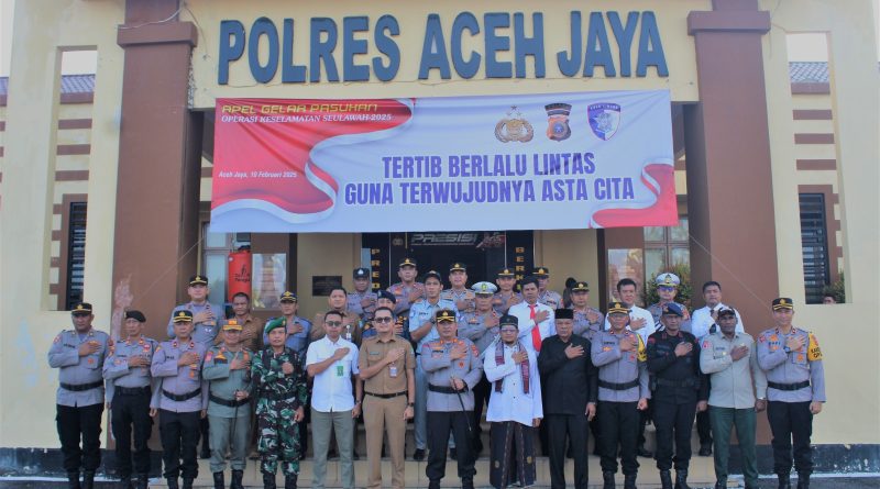 Calang – Kepolisian Resor (Polres) Aceh Jaya, Polda Aceh, menggelar Apel Gelar Pasukan Operasi Keselamatan Seulawah 2025 di Lapangan apel Mapolres Aceh Jaya, Senin (10/2/2025). Kegiatan ini merupakan langkah awal dalam rangka menciptakan keamanan, keselamatan, ketertiban, dan kelancaran lalu lintas (Kamseltibcarlantas) menjelang bulan suci Ramadhan 1446 H.