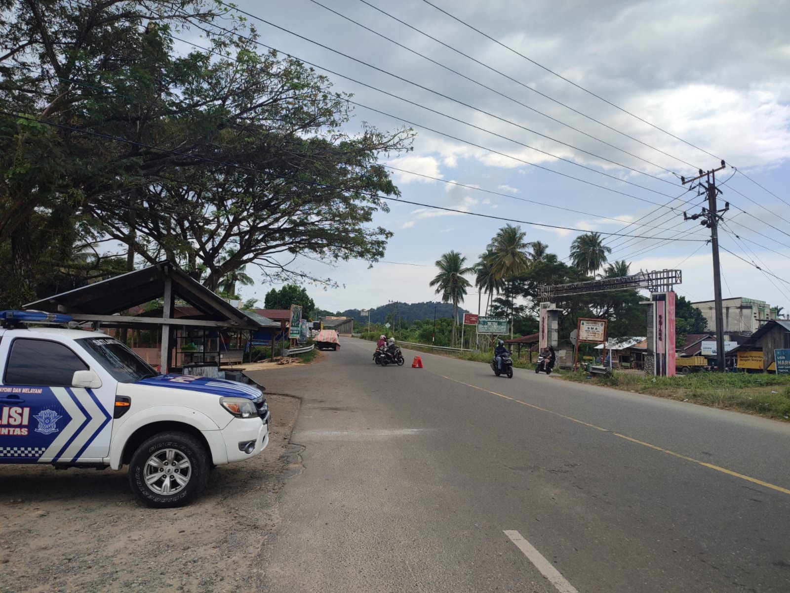 Personel Polres Aceh Jaya Lakukan Pengaturan Lalu Lintas di Persimpangan Rumah Duka Alm. Aba H. Asnawi Bin Tgk Ramli (Aba Budi Lamno) di Dayah Budi Lamno.