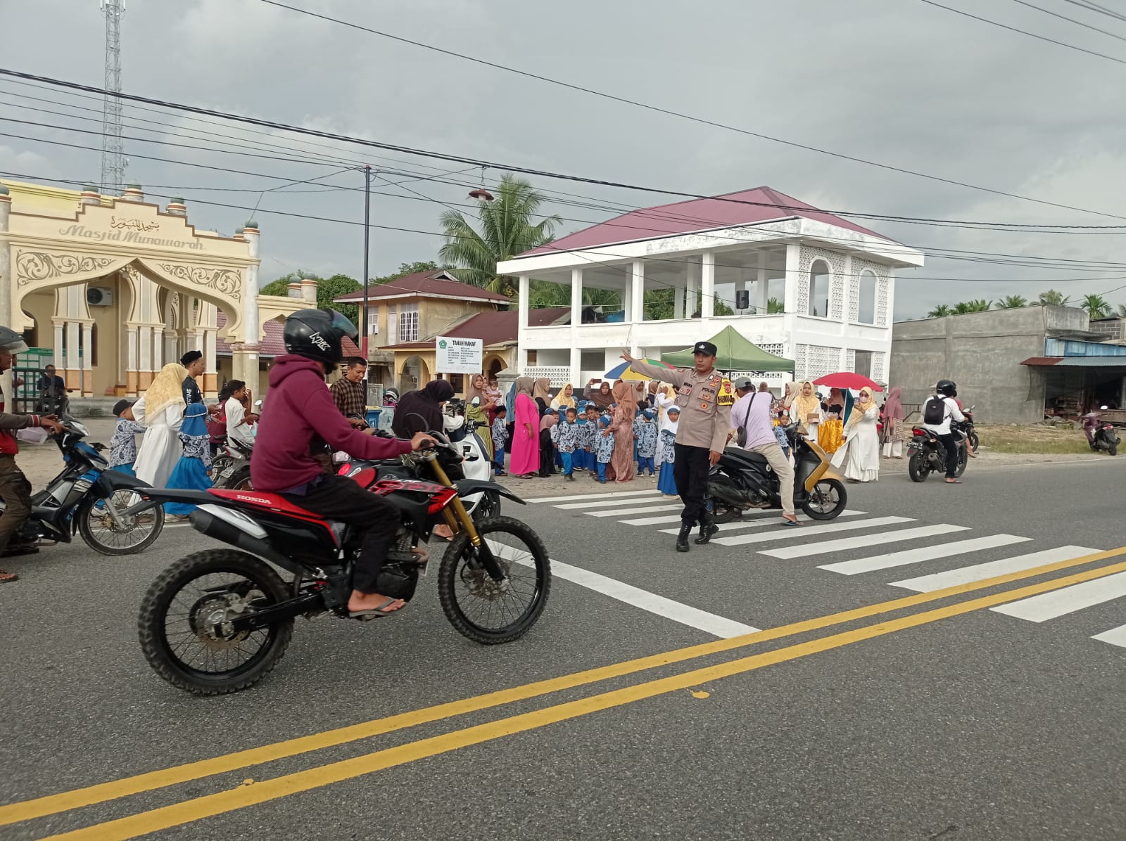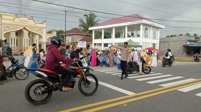 Calang – Personel Polsek Krueng Sabee melaksanakan pengamanan dan pengaturan lalu lintas dalam rangka mendukung kegiatan pembagian takjil yang diselenggarakan oleh TK Negeri Harapan Bangsa di Kecamatan Krueng Sabee, Kabupaten Aceh Jaya. Kamis 13 Maret 2025.
