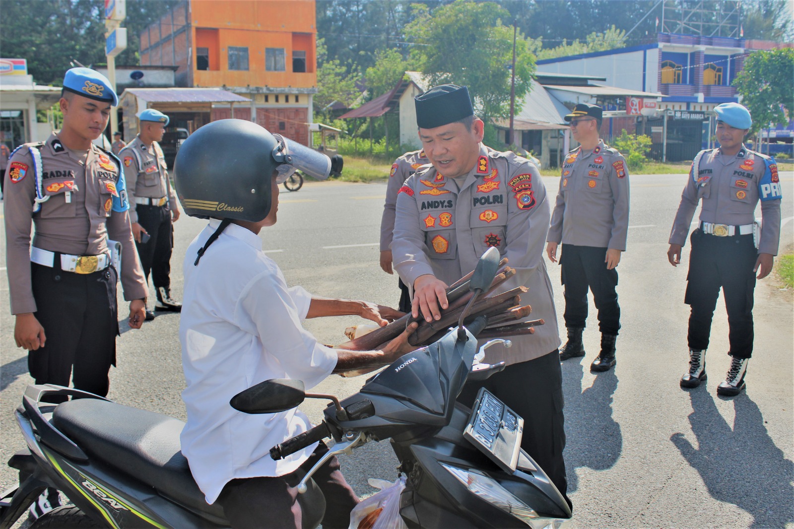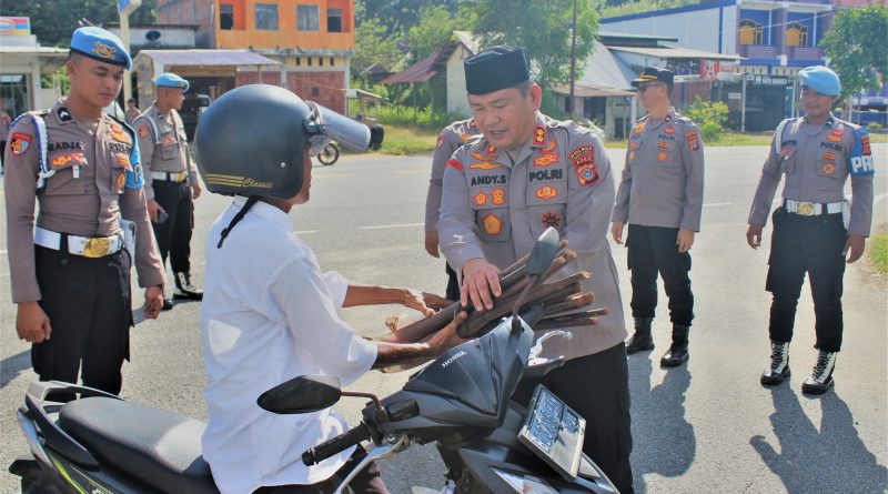 Calang – Menyambut bulan suci Ramadan dengan semangat berbagi, Kapolres Aceh Jaya AKBP Andy Sumarta, S.I.K., bersama personel turun langsung ke jalan untuk membagikan takjil gratis kepada masyarakat dan pengendara di sekitar Tugu Kantor Bupati Aceh Jaya, Kamis (13/3/2025).