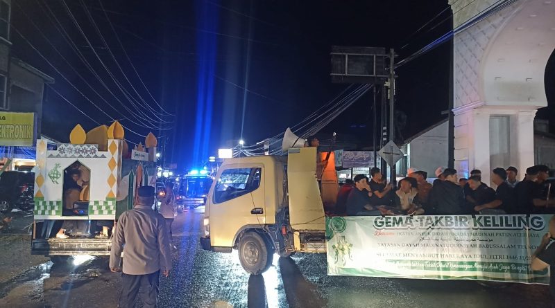 Calang – Dalam rangka menyambut Hari Raya Idul Fitri 1446 H, jajaran Polsek Teunom bersama Forkopimcam Teunom dan Forkopimcam Pasie Raya menggelar Pawai Takbir yang berlangsung pada Minggu malam 30 Maret 2025 sekitar pukul 21.00 WIB Kegiatan ini dilaksanakan di dua lokasi yaitu di Masjid Baiturrahman Desa Keude Teunom Kecamatan Teunom dan Masjid Baiturrahman Desa Tuwi Kareung Kecamatan Pasie Raya Kabupaten Aceh Jaya. Senin 31 Maret 2025.