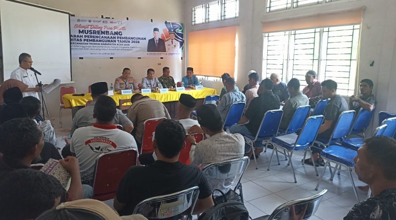 Calang — Dalam rangka penyusunan rencana pembangunan daerah tahun 2026, Musyawarah Perencanaan Pembangunan (Musrenbang) Kecamatan Teunom dilaksanakan di Aula Kantor Camat Teunom, Desa Padang Kleng, Kecamatan Teunom, Kabupaten Aceh Jaya, dengan mengusung tema “Pembangunan SDM unggul dan berkualitas dalam rangka penguatan transformasi perekonomian Aceh Jaya yang inklusif, inovatif dan berkelanjutan.” Sabtu 10 Mei 2025.