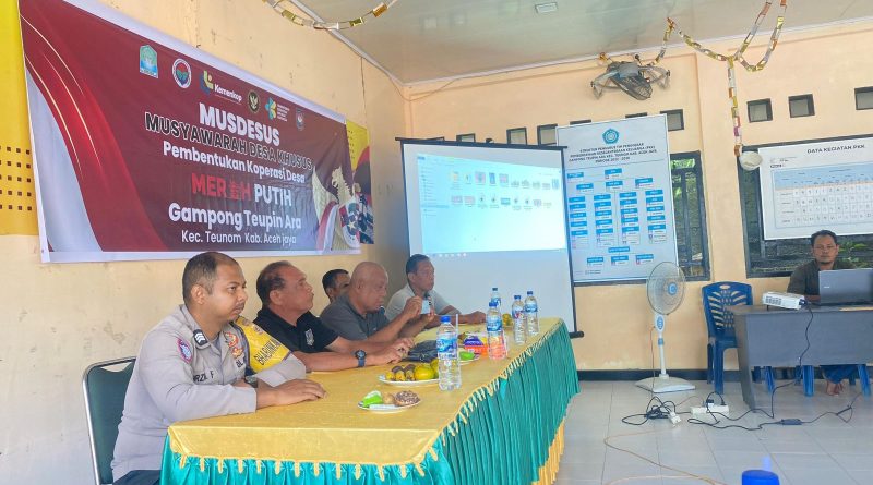 Calang – Dalam rangka mendukung program kerja Satuan Binmas Polri terkait pembinaan masyarakat serta sebagai bentuk sinergi antara Polri dan pemerintah desa, Bhabinkamtibmas Polsek Teunom, BRIGPOL Mirza Fardhiananda, menghadiri kegiatan Musyawarah Desa dan Penetapan Pengurus Koperasi Merah Putih yang dilaksanakan di Balai Desa Gampong Teupin Ara, Kecamatan Teunom, Kabupaten Aceh Jaya. Minggu 25 Mei 2025