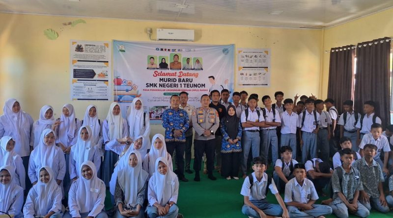 Calang – Dalam rangka mendukung terciptanya generasi muda yang berakhlak, cerdas, dan sadar hukum, Polsek Teunom, Polres Aceh Jaya, melaksanakan kegiatan sosialisasi dalam rangka Masa Pengenalan Lingkungan Sekolah (MPLS) di SMK Negeri 1 Teunom, JUmat, 18 Juli 2025.