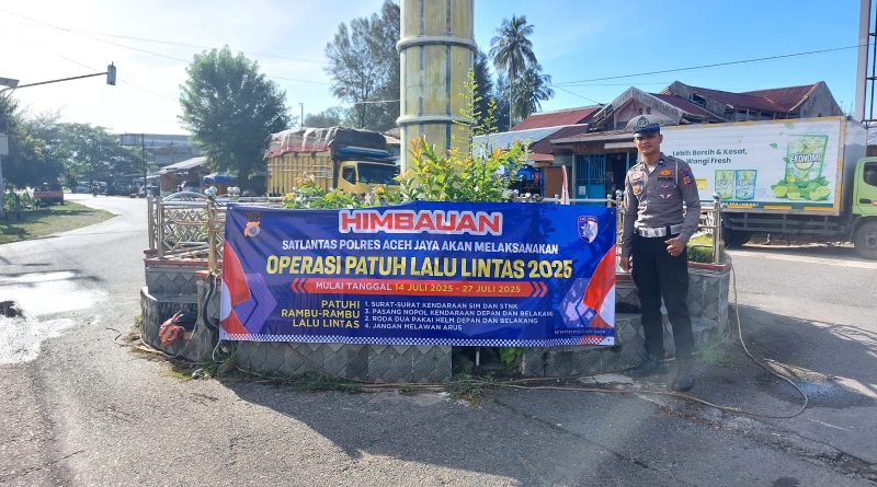 Calang — Dalam rangka mendukung pelaksanaan Operasi Patuh Seulawah 2025, Satuan Lalu Lintas Polres Aceh Jaya melaksanakan kegiatan sosialisasi keselamatan berlalu lintas melalui pemasangan spanduk himbauan di sejumlah titik strategis. Kegiatan ini ditujukan kepada para pengguna jalan guna meningkatkan kesadaran dan kepatuhan terhadap aturan lalu lintas. Sabtu 19 Juli 2025.