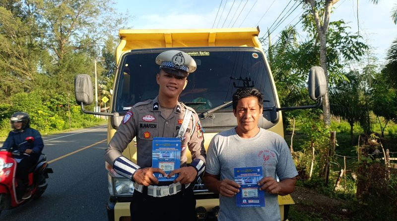 Calang — Dalam rangka mendukung pelaksanaan Operasi Patuh Seulawah 2025, Satuan Lalu Lintas (Satlantas) Polres Aceh Jaya menggelar kegiatan “Polisi MeuPep”, yakni pembagian brosur dan penempelan stiker himbauan keselamatan lalu lintas kepada masyarakat dan pengguna jalan. Minggu 20 Juli 2025.