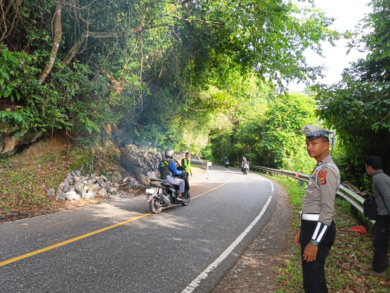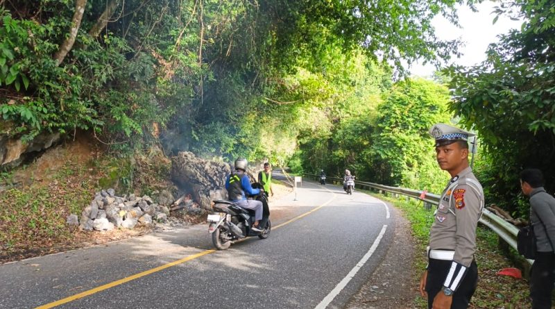 Antisipasi Kecelakaan Akibat Longsoran Batu, Satlantas Polres Aceh Jaya lakukan Pengamanan Jalur Rawan di Gunung Geurutee