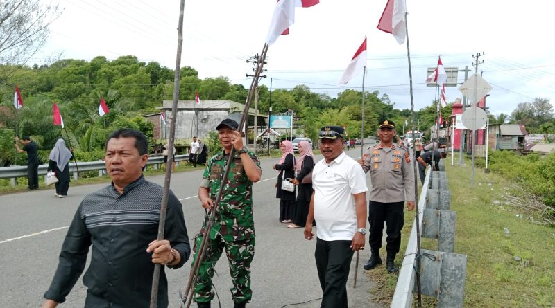 Kapolsek Sampoiniet Bersama Muspika Laksanakan Pemasangan Bendera Merah Putih di Pusat Kecamatan dalam Rangka Menyambut HUT RI ke-80