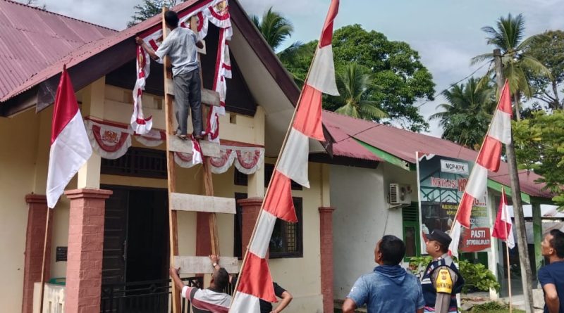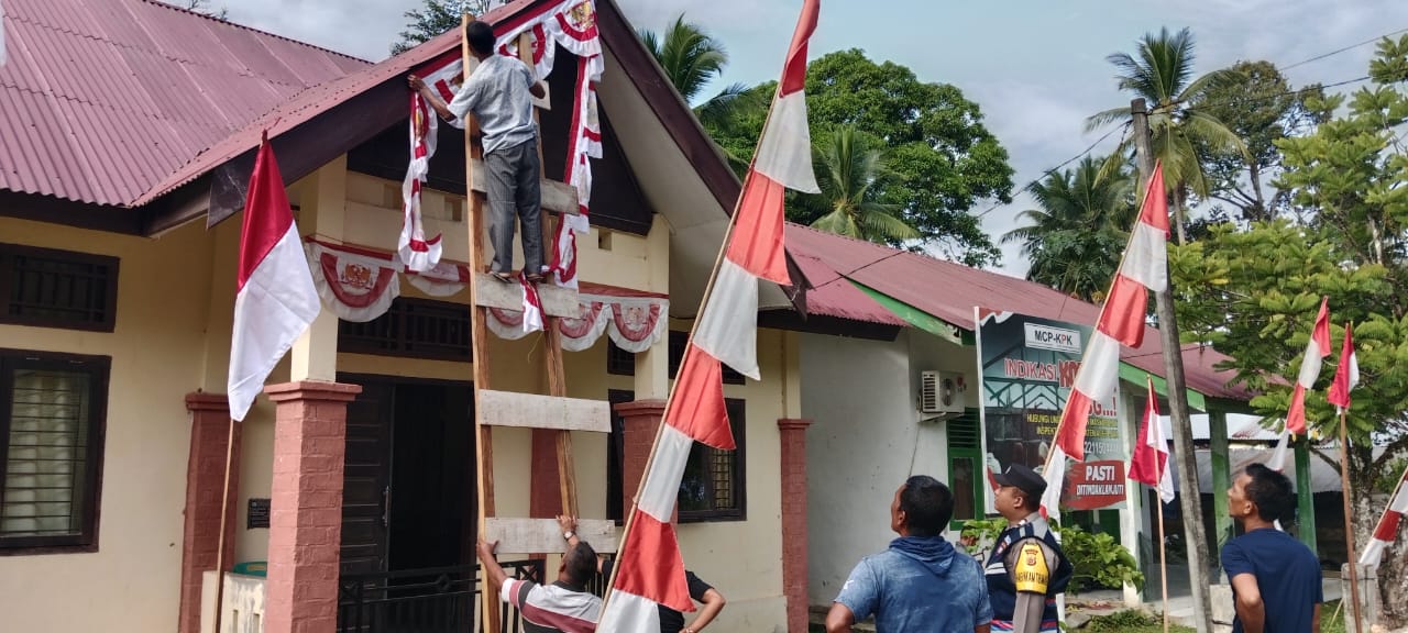 Calang – Menyambut Hari Ulang Tahun ke-80 Kemerdekaan Republik Indonesia, Bhabinkamtibmas Polsek Setia Bakti BRIGPOL Debi Dian S melaksanakan kegiatan pemasangan Bendera Merah Putih di Kantor Desa dan Pos Kamling Desa Pante Kuyun, Kecamatan Setia Bakti, Kabupaten Aceh Jaya, Selasa (5/8/2025).
