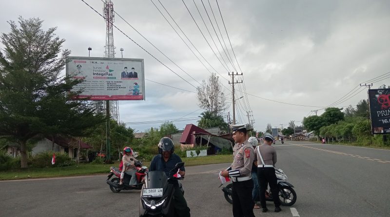 Calang – Dalam rangka menyambut Hari Ulang Tahun Kemerdekaan Republik Indonesia ke-80, Satuan Lalu Lintas (Satlantas) Polres Aceh Jaya melaksanakan kegiatan pembagian Bendera Merah Putih dan himbauan tertib berlalu lintas kepada pengguna jalan. Kegiatan ini digelar pada Rabu, 6 Agustus 2025, mulai pukul 08.00 WIB hingga selesai, di dua lokasi strategis, yakni Simpang Gerbang Raja Desa Panton Makmur dan Simpang Bundaran Kantor Bupati Desa Ketapang, Kecamatan Krueng Sabee, Kabupaten Aceh Jaya.