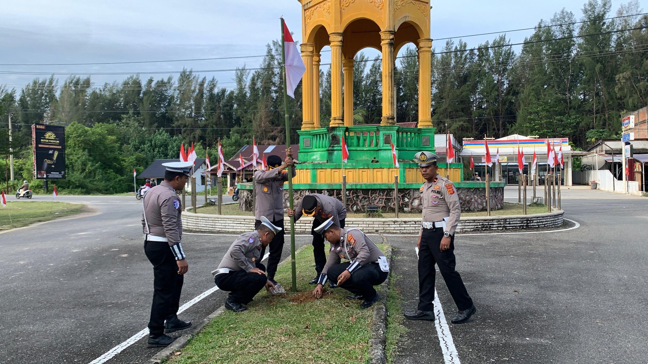 Kapolres Aceh Jaya Pimpin Pemasangan Bendera Merah Putih di Simpang Tugu Kantor Bupati Calang Sambut HUT RI ke-80