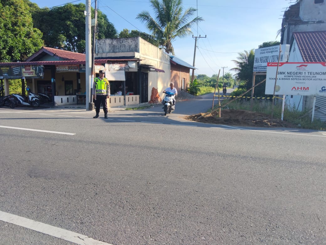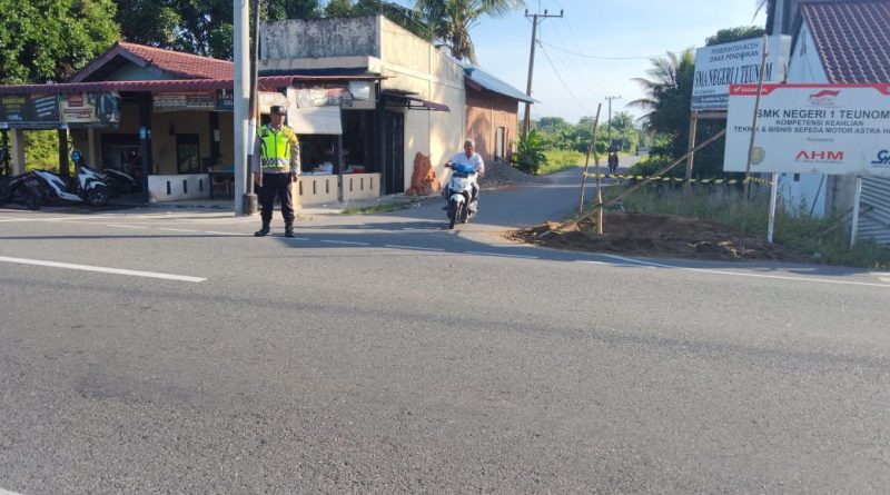 Calang – Personel Polsek Teunom Polres Aceh Jaya melaksanakan kegiatan Strong Point pada Jumat pagi, 3 Oktober 2025, sekitar pukul 07.30 WIB di Jalan Nasional Banda Aceh – Meulaboh, tepatnya di simpang masuk menuju kompleks SMAN 1 Teunom, Desa Tanoh Manyang, Kecamatan Teunom, Kabupaten Aceh Jaya.