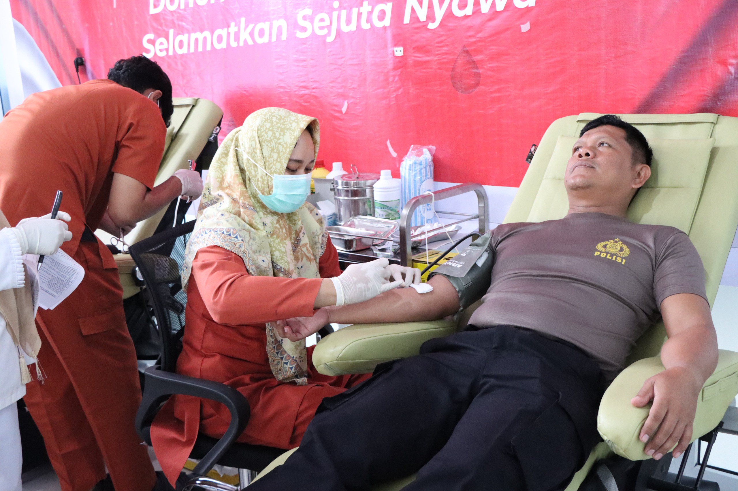 Donor darah dimulai sejak pukul 09.00 WIB dengan rangkaian kegiatan meliputi pengisian data peserta, pemeriksaan tekanan darah, penentuan golongan darah, hingga proses pengambilan darah sebanyak satu kantong (350 cc) per peserta.