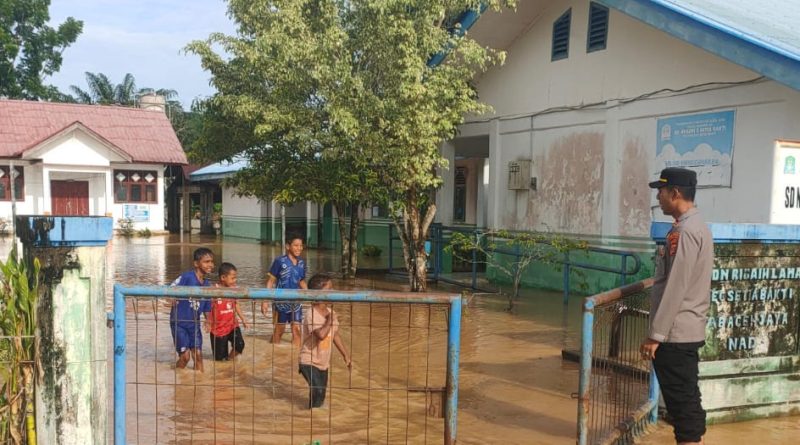 Calang – Akibat hujan deras yang mengguyur wilayah Kabupaten Aceh Jaya sejak Senin malam, sejumlah desa di Kecamatan Setia Bakti dilaporkan terdampak banjir. Berdasarkan hasil pantauan Kapolsek Setia Bakti bersama personel Polsek Setia Bakti, pada Selasa (4/11/2025) sekira pukul 08.30 WIB, teridentifikasi satu desa yang mengalami genangan air cukup tinggi, yaitu Desa Lhok Bot.