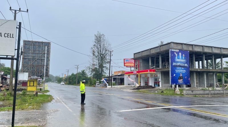 Pagi Tertib Meski Diguyur Hujan, Sat Lantas Polres Aceh Jaya Tetap Laksanakan Strong Point di Titik Rawan Laka dan Macet