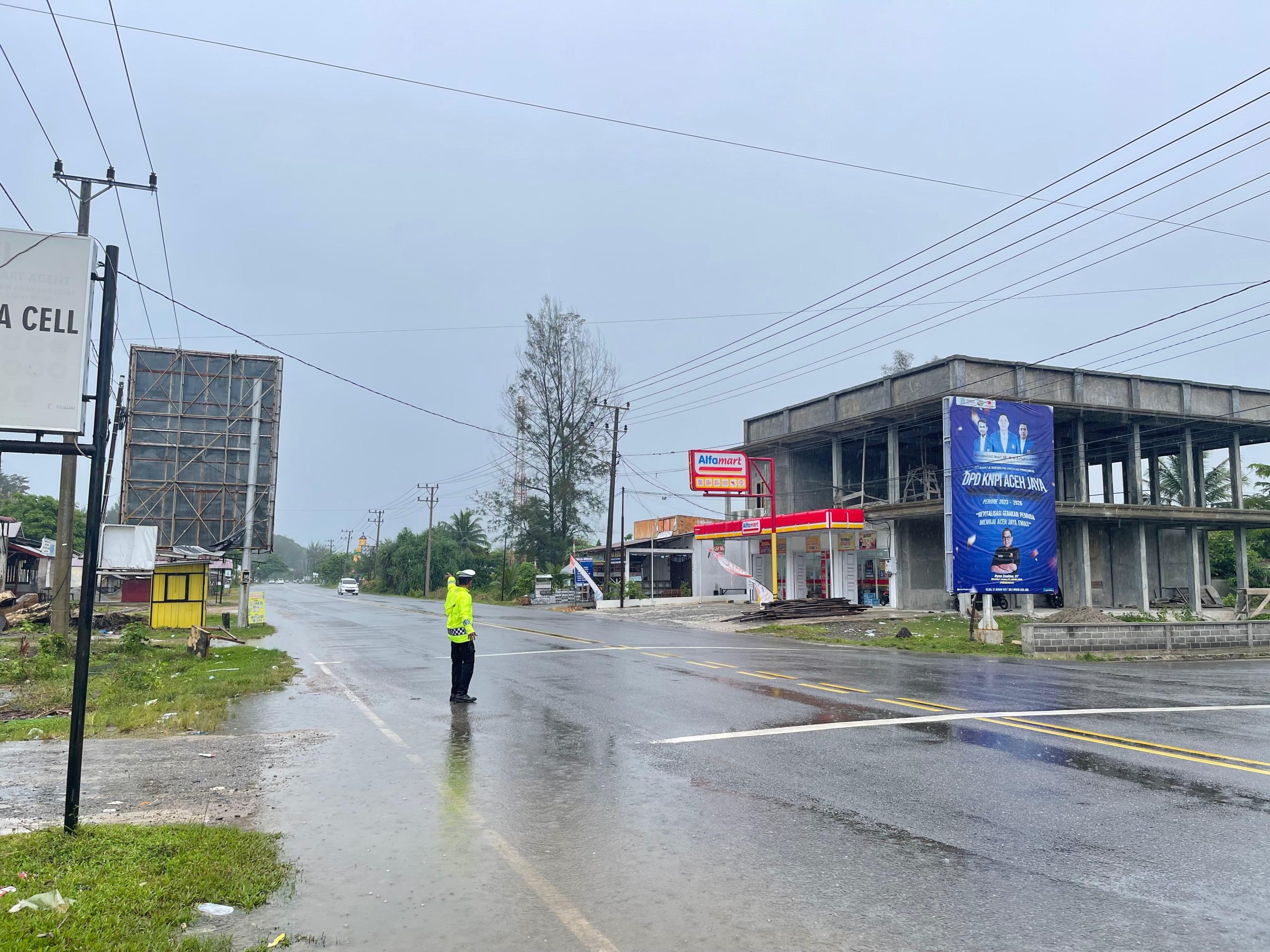 Pagi Tertib Meski Diguyur Hujan, Sat Lantas Polres Aceh Jaya Tetap Laksanakan Strong Point di Titik Rawan Laka dan Macet