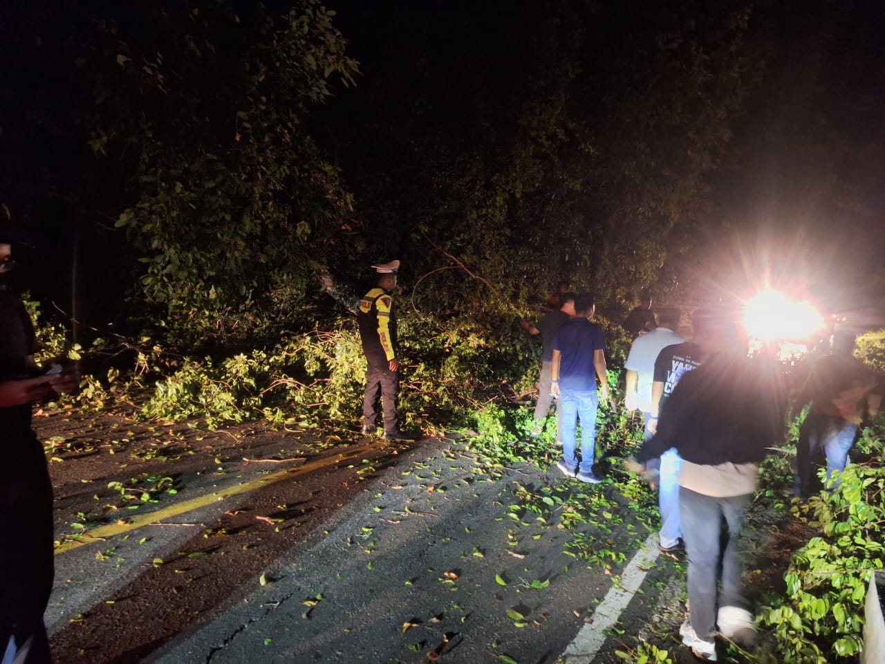 Calang – Personel Satuan Lalu Lintas (Sat Lantas) Polres Aceh Jaya bergerak cepat melakukan pengaturan arus lalu lintas di lokasi terjadinya pohon tumbang di Jalan Lintas Banda Aceh–Meulaboh, kawasan Gunung Geurutee, Kecamatan Jaya, Kabupaten Aceh Jaya, Minggu malam (11/1/2026).