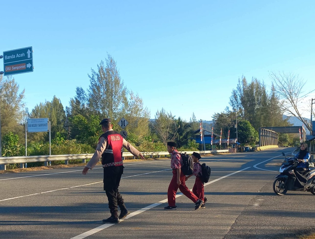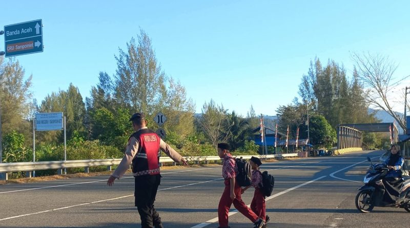 Calang – Guna memastikan keselamatan pelajar sekolah serta menciptakan kelancaran arus lalu lintas di pagi hari, personel Polsek Sampoiniet Polres Aceh Jaya melaksanakan kegiatan Strong Point pagi di wilayah Kecamatan Sampoiniet, Kabupaten Aceh Jaya, Kamis (5/2/2026).