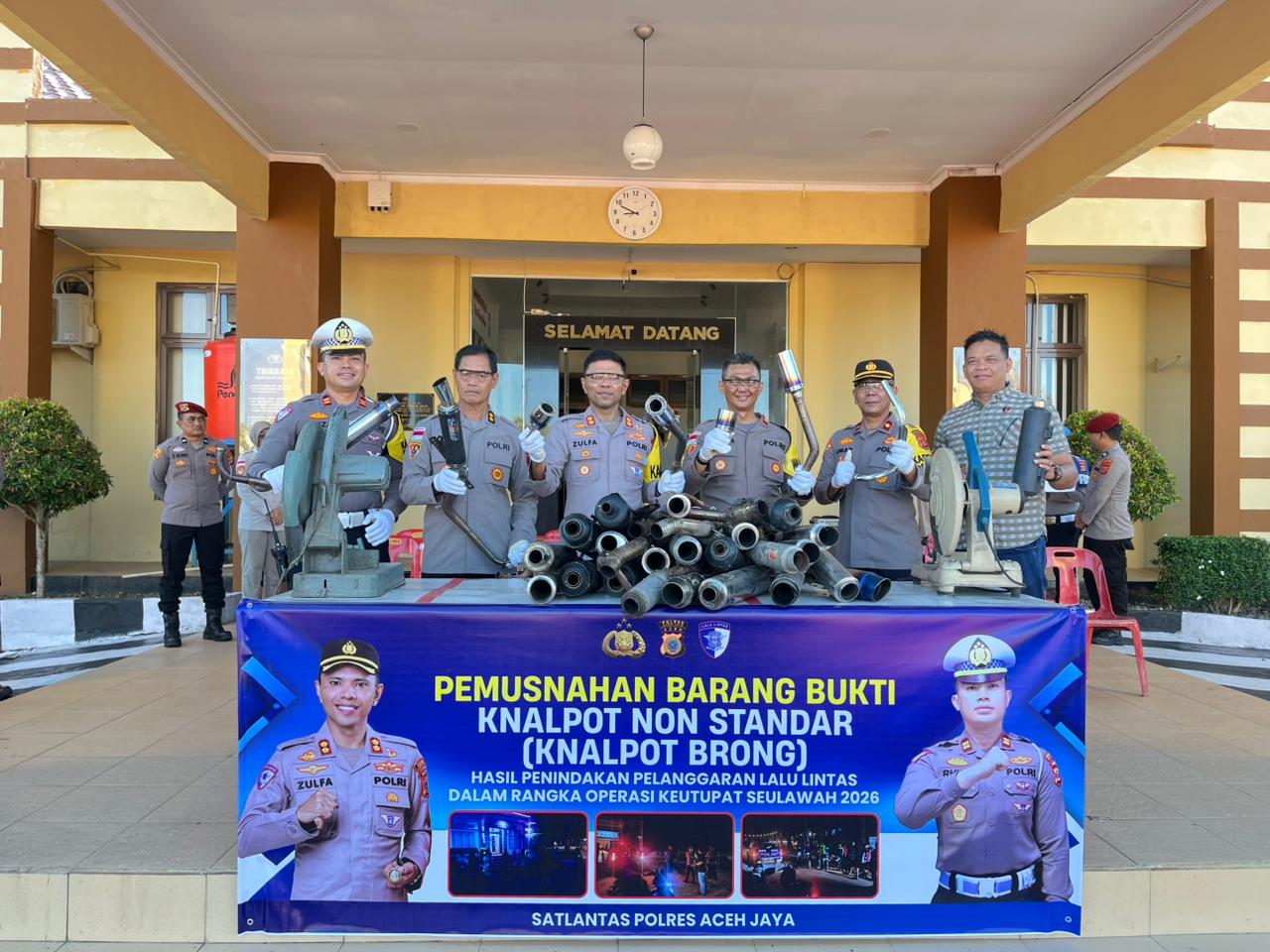 Calang – Dalam upaya menjaga ketertiban dan kenyamanan masyarakat selama bulan suci Ramadhan, Polres Aceh Jaya melaksanakan kegiatan pemusnahan barang bukti knalpot non standar (knalpot brong) hasil penindakan pelanggaran lalu lintas dalam rangka Operasi Seulawah Tahun 2026, Rabu (18/3/2026).