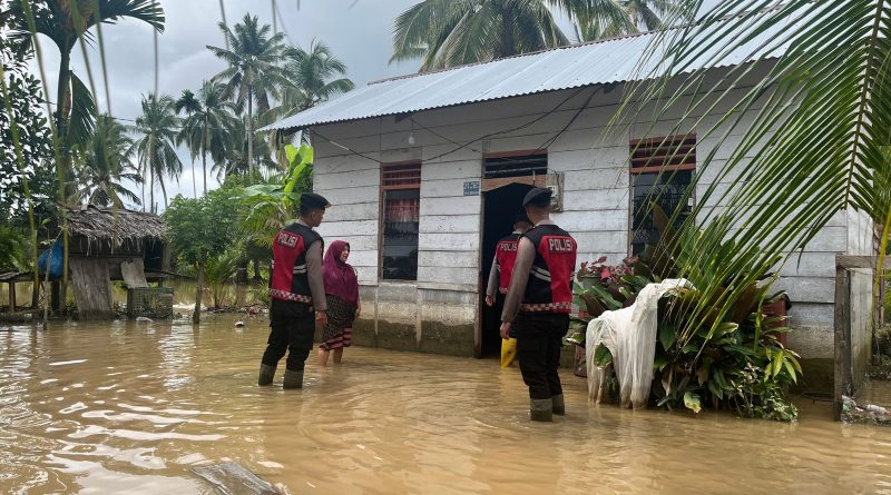 Calang – Dalam upaya memastikan keselamatan masyarakat dan memonitor kondisi permukiman warga yang terdampak banjir, personel Sat Samapta Polres Aceh